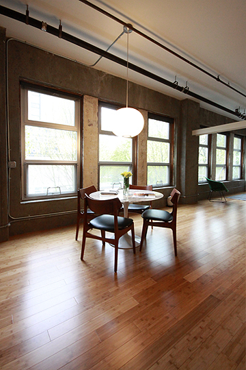 Upon entering Aaron’s house I was struck by how purposeful each piece of furniture and fixture is to the overall space. Located in Portland’s Pearl District, this space was originally built as a warehouse in the 1920s. It underwent an unfortunate makeover in the 80s featuring shabby wall-to-wall carpet and heavy gold drapes to divide up the space. Lucky for Aaron, who is crazy busy with his business, his realtor Shannon also works as an interior designer and consultant, SBaird Design. She understood Aaron’s vision for a minimal, raw space and undertook the mission of converting his new loft to the modern, industrial home it has become. Last year Aaron’s loft was even featured in Oregon Home Magazine!