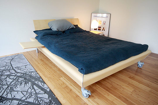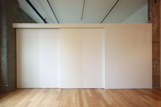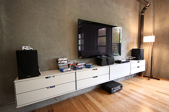Aaron is a computer programmer and is visually intrigued by the way things work. Using this as a guide, Shannon took the walls back to their concrete foundation and exposed wooden structural beams. A pipe that drains the rainwater from the roof of the building was left alone and offers great sound effects on a rainy spring day. New lighting was added and the wiring was left intentionally visible. The concrete walls are balanced by newly added bamboo flooring. It’s a long space that was divided by installing a pocket wall that can hide the bedroom when guests are over. Each panel of the sliding wall is painted a slightly different tone of white to add interest. The closets that were built in his room (the only storage in the whole space!) were built to mimic the Vitsoe shelves he uses in his living room. The rug she found for the bedroom area emulates the shadows that the trees outside his windows create on the floor. All of the small details really make for a nice overall experience and 2 years later Aaron still seems quite happy in his minimal digs.
