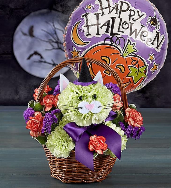Fresh white carnations shaped like a dog (!) with vibrant green, purple, and orange blooms all around make up this darling witchy pooch bouquet, which features the pup in a black witch hat. There’s the option to add a “Happy Halloween” balloon for a few dollars more. Buy: Witchy Pooch, $54.99+