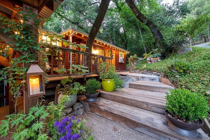 This enchanting scene could be your reality if you were to buy this charming home for sale. Nestled in the woods of California’s wine country, the two-bedroom abode looks to resemble a treehouse, thanks to its leafy surroundings. A set of steps leads to that front porch, where two Adirondack chairs flank a live tree growing through the deck.