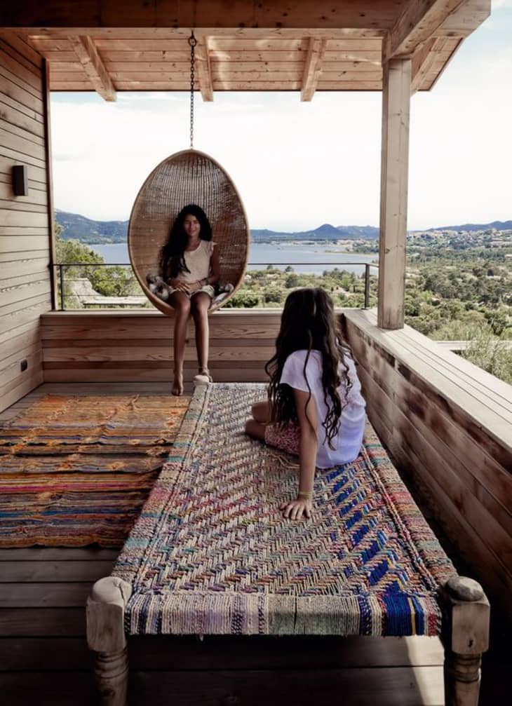 A hanging chair provides a stunning vantage point overlooking the water in this family home on Corsica, captured by Milk Magazine.