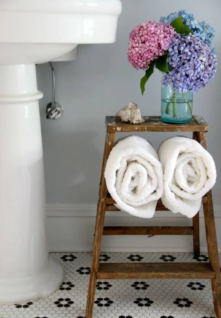13. A vintage ladder is the perfect towel rack, and the best part for renters is that you can take it with you when you move. This example is from Better Homes & Gardens.