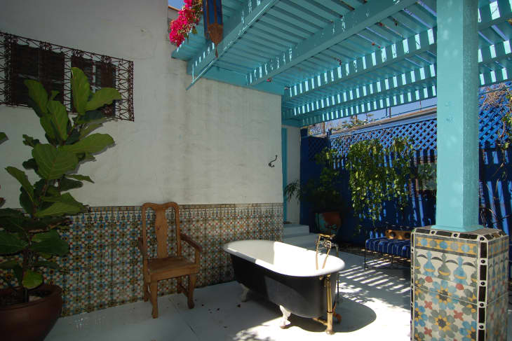 This thing is it. Set on a stone patio surrounded by Moroccan-style tiles and a turquoise-painted pergola strewn with bright-pink bougainvillea, this sun-dappled tub looks like the dreamiest place to take an afternoon soak. And, after a bath, you can enjoy a light lunch at the cafe table in the garden, or sunbathe in one of the plush lounge chairs.
