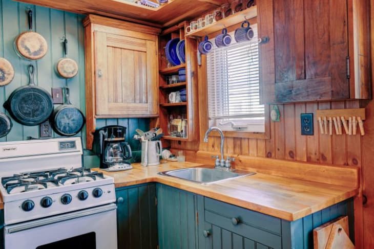 Inside, wood paneling takes what would be an otherwise regular room and transforms it into the coziest little hideaway. Though it has a small footprint, the main living space makes space for lounging, dining, and meal prepping in the tiny kitchen, which is a marvel of its own. Built-in shelves, small cabinets, and wall hooks make it a lovely little cooking station.