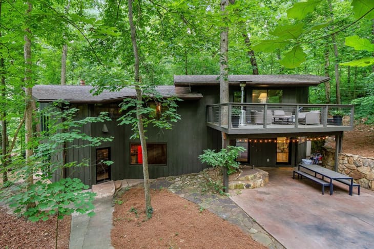 One look at the outside of this mid-century style home for sale in Knoxville and you might already be sold: charcoal gray paint, a spacious deck, and a patio softly lit by string lights. What’s not to like?