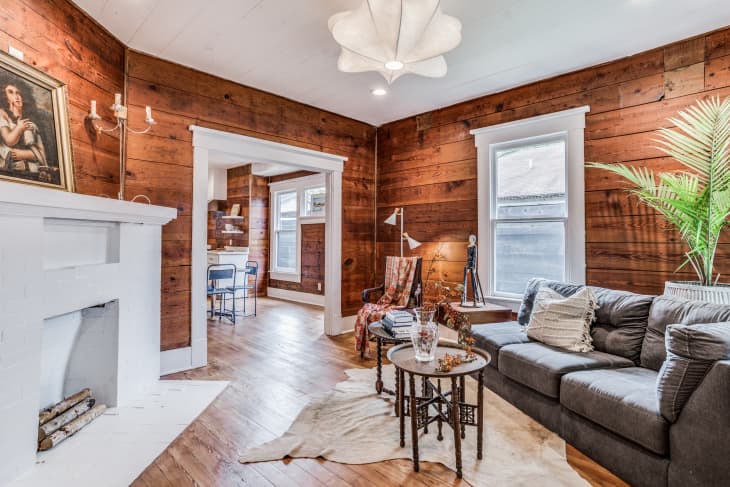 The home was recently renovated, and its walls were stripped to their original 1930s paneling. (The shiplap ceilings and wooden doors are original, too.) The main living area is anchored by a decorative brick fireplace that’s been painted white. The room opens to an open-concept eat-in kitchen with all-new cabinets, appliances, open shelving, and stylish pendant lights.