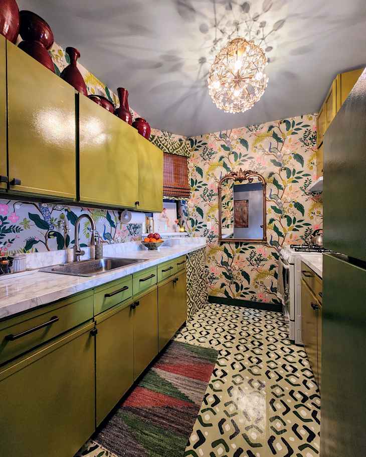 What I love about this makeover is Minetta’s ability to achieve such a striking change without any major reconstruction. The fun, colorful printed wallpaper seamlessly complements the green kitchen cabinets. I also love how she covered the counters with faux marble contact paper, which adds to its modernity. It’s common for people who have lived in a space for years to wish for modern appliances or a new layout to freshen things up. However, instead of tearing out the cabinets or reworking the layout, Minetta used simple tools for her kitchen makeover.
