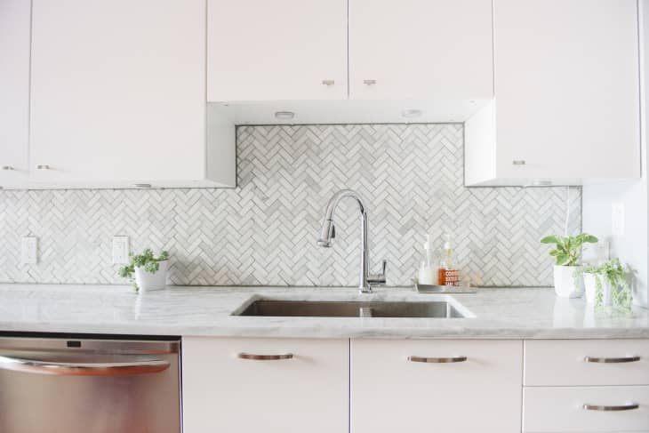 The new kitchen is mostly white on white. We purchased the simple white cabinets from IKEA to keep costs down. We found our own knobs and handles for a clean look. I had a lot of fun picking out the granite countertop (I wanted the look of marble but without the fuss, so this white and grey countertop was perfect). Since our kitchen was so small, I was able to splurge on a higher end marble herringbone backsplash.