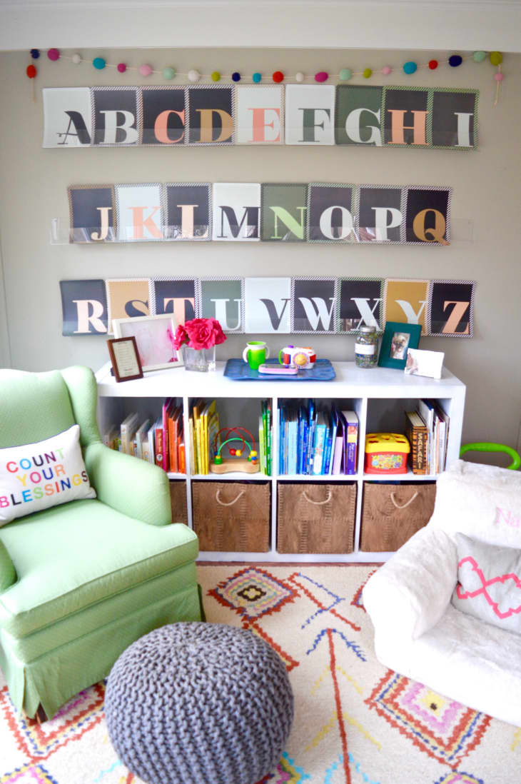 We pushed the furniture to the sides of the room to create empty space for play. My desk is in one corner, and I love the light that streams over it as it looks toward our backyard. The opposite corner houses a thrifted green chair where we read or where I sit and drink coffee and answer emails. I arranged the books on our IKEA shelves by color for the fun aesthetic, but what I really love is how the bins below hide the clutter of random toys.