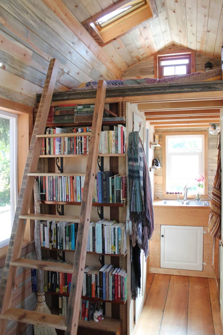 Her house, which she built with the help of some very generous friends, is based on the Cypress, by Tumbleweed Tiny Houses. She did modify the plan a bit — the gambrel roof adds a little extra headspace in the loft, and instead of a staircase with drawers, she opted instead for a ladder, with a whole wall of bookshelves behind.