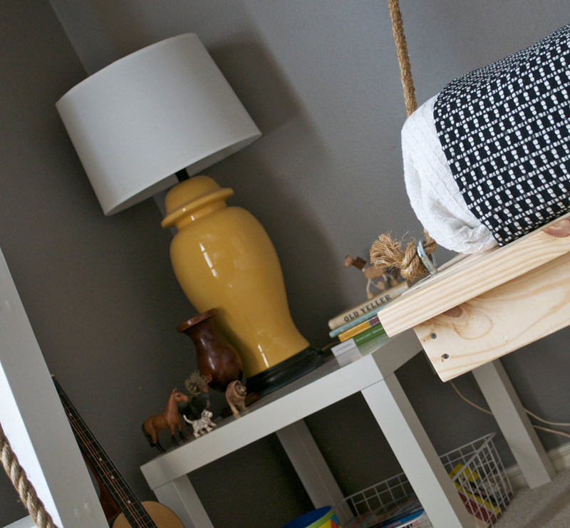 Assess what your needs are for the space. If your kids don’t need every toy in plain sight, put some away. When it comes to kids’ rooms, less is definitely more. The boys come up with all kinds of games and spend so much time reading in their room, rarely using toys. They don’t need desks because we have a school room. Their toys are stored in the playroom. Their room really only needed beds, so we could get creative. This helps to simplify a room and is great for cleaning up! The simplicity of the space really inspires their imagination- one day it’s a submarine, the next a jungle, and sometimes a jail! Look for accessories outside the kid’s section- most of the items in this room are not designed for kids. And if you have multiple kids in one room, remember that you have to multiply every expense, in my case, by three! I would see something that I really liked that might have been an ok splurge for a room for one child, but not for three!