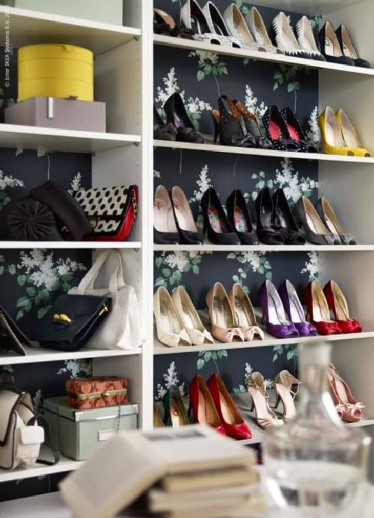 Here’s another example of wallpapered bookcases in the closet, from IKEA. If you don’t want to (or aren’t able to) take out the back of the bookcase and cover it in paper, you can cut pieces of cardboard or chipboard to the size of each shelf, cover them in paper, and pop them in.