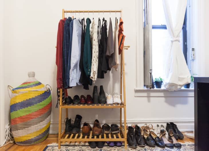 I owned entirely too many shoes given the size of our apartment. Once I got rid of what I no longer wore or wanted, we were actually able to downsize garment rack’s and now have a slim wooden version that has a smaller footprint than before.