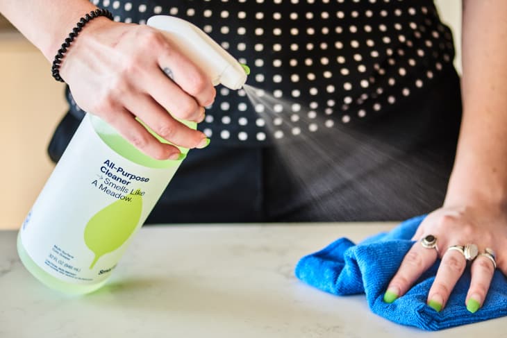 If you have specialty surfaces like marble or copper at home that you’d prefer to keep looking luxe, take a pause before spraying with all-purpose cleaner (or any cleaner, really). Bell says to always refer to the manufacturer’s instructions (the company’s website might have more details than the product’s label about which surfaces are safe). And before you spray with abandon, spot-test in an inconspicuous area. “Copper can be cleaned with a simple vinegar and salt solution, followed off with a microfiber wipe down to give it a good shine,” she says. “Marble can be harmed by cleaners that are too acidic, so using diluted dish soap or castile soap and a soft cloth can be the best option for these.”