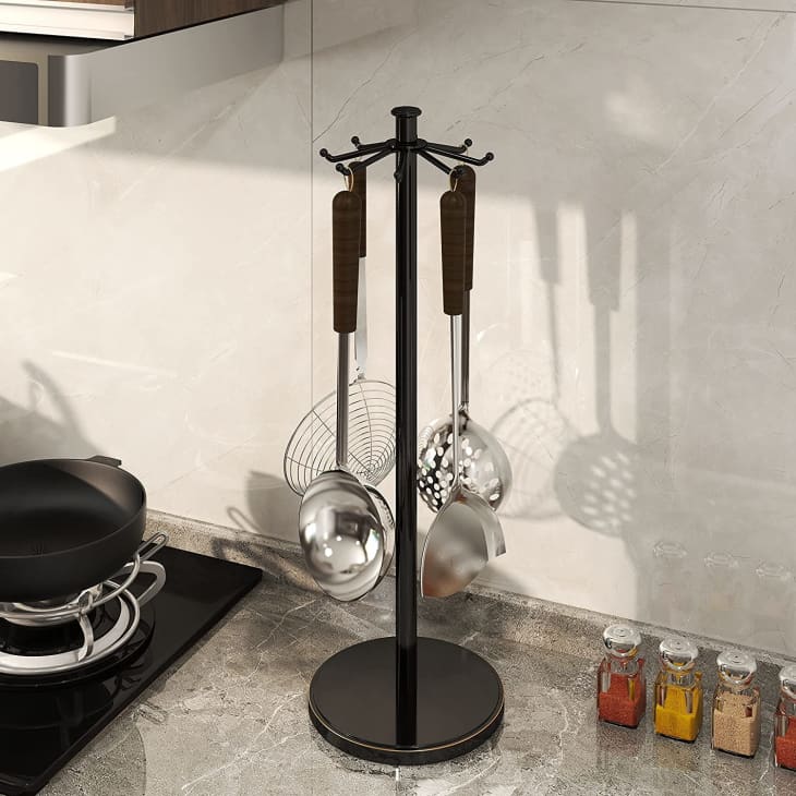 Utensil crock pots are certainly stylish, but if you only have room for one countertop utensil holder, they’re not ideal. They become overcrowded too easily, and whenever you try to grab just one tool, the rest try to jump out with it. Your counters will look tidier and you’ll have an easier time using your tools if each one has its own space to hang out, like they do with this rotating under-counter gadget. Now, thankfully, you can get the same great functionality (and better portability) without having to attach anything under your cabinets. This standing rack has enough hooks for all your large utensils — and it will free up your drawers in no time.