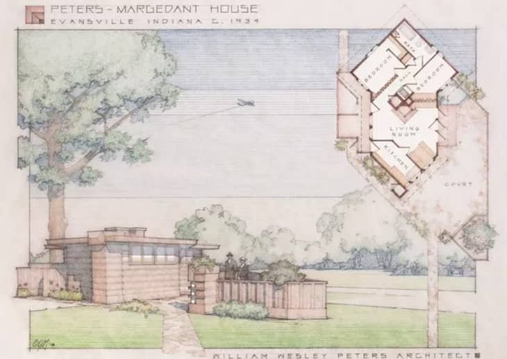 William Wesley Peters was Frank Lloyd Wright’s first apprentice, and worked closely with him during the later part of his life. But from 1933 to 1935, the famous architect and his protege had a bit of a falling-out over Peters’ relationship with Wright’s adopted daughter, Svetlana, and Peters started a practice on his own. It was then that he designed the two-bedroom, 552 square foot Peters-Margedant house, which style-wise bore a close resemblance to Wright’s own work.