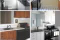 Let’s just say the kitchen was not what attracted us to our new home. Country rooster decor was in abundance and so were peeling vinyl floor tiles, 80s lace valances, and honey-stained cabinetry — not exactly our dream kitchen. However, coming out of grad school, we weren’t really in a position for a total dream kitchen remodel, so we prioritized our list of essential updates, enlisted a handyman friend, and went to work…FIRST ROW• 1 Before & After views.