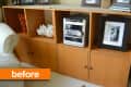Sharon and her husband have had these beech shelves from IKEA for almost 20 years, and had no desire to replace these perfectly functional (if outdated) units while they still have life in them. Luckily Sharon had a vision of how she might update these cabinets — a vision she was able to implement for only $10, thanks to a well-stocked DIY supply cabinet.After a light sanding, Sharon primed the piece with an oil-base primer and then covered it with a latex paint.