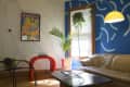 Meg’s Memphis-Inspired ’80s ApartmentName: Meg Location: Logan Square — Chicago, Illinois Last year my boyfriend and I scored a Memphis Design Group exhibit poster at a garage sale down the street for $7. I’d been wanting to do an ’80s apartment for ages, but never pulled the trigger (I was getting my design fix through my blog). Neal was on board and began to make a copy of our favorite Memphis pendant lamp, “The Santa Fe” by Matteo Thun, out of balsa wood and an IKEA lamp cord. Thanks, Meg!