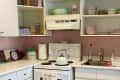 Amanda Lowthian added a pink adhesive backsplash and adhesive checker flooring took the doors off the cabinets in the kitchen, installed shelves over radiators, and added lots of art and unique accents.