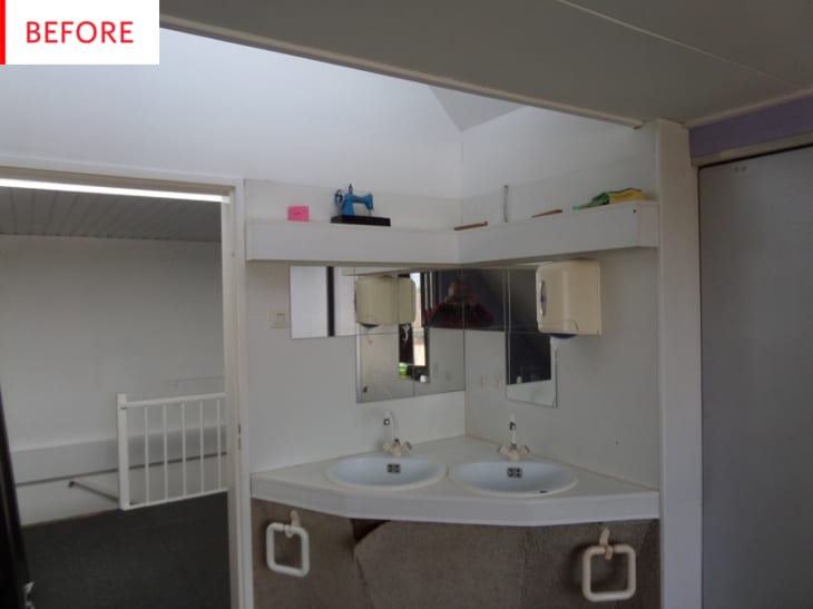 When interior stylist Jaimy and her husband Marcel wanted a quieter place to live, they decided to move to her hometown…where they were able to buy her childhood home. To truly make it their own, the new home needed quite a few updates. One of the most striking transformations has been the attic. The idea was to let daughter Dalí have the master bedroom, so Marcel and Jaimy could inhabit the top floor. It sure is spacious enough, but a lot work needed to be done. Like most attics, it had been used for storage without paying much attention to aesthetics. An outdated sink unit was still in place, but slowly falling apart. This floor was, to put it mildly, rather depressing.