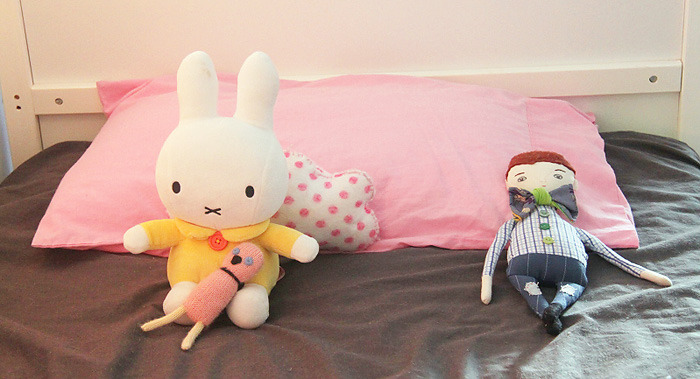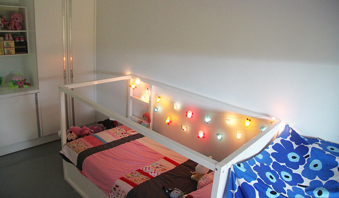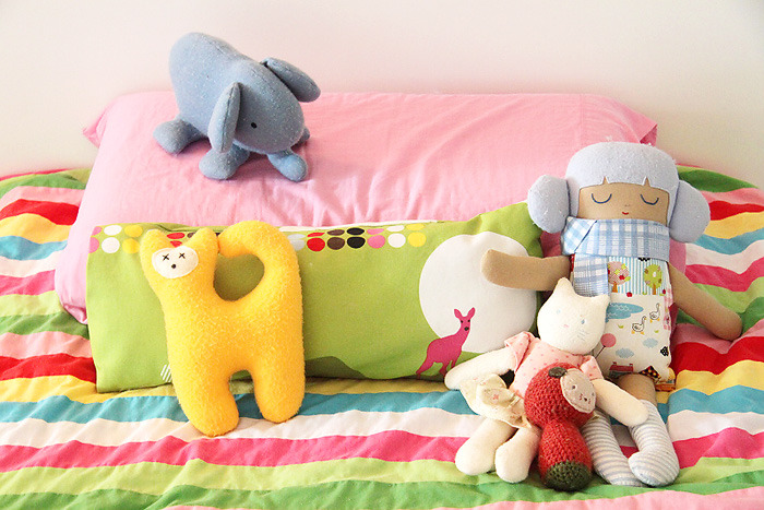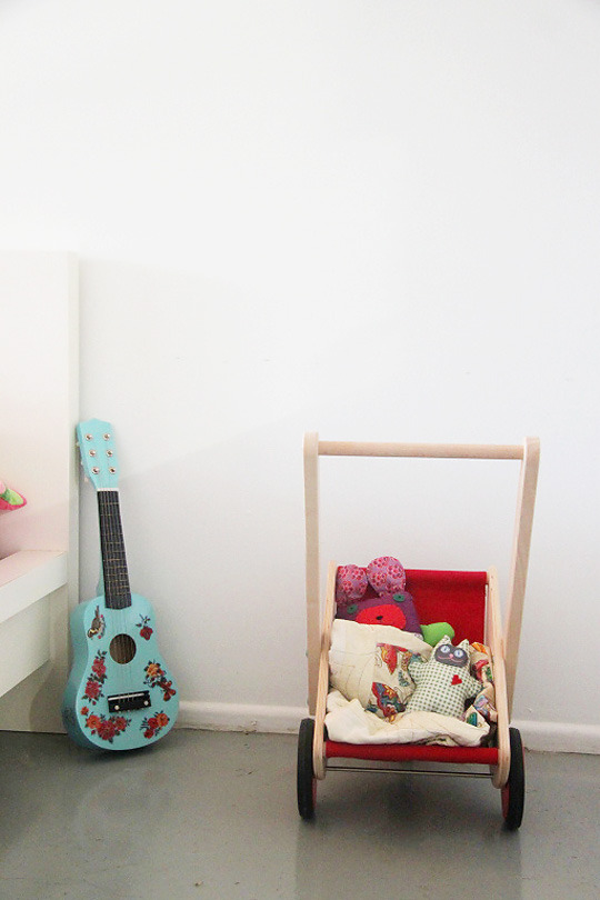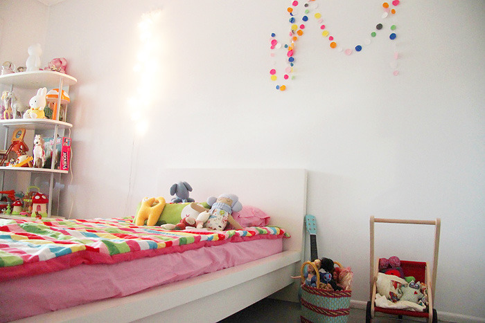 There are quite a few actually. In Ava’s room, I made her colourful quilt and her dot garland which is made from felt and paper on linen string. She also has quite a few handmade toys. While in Piper’s room, again, I made her quilt, the floor cushion in her cubby house and her actual cubby house is made from Marimekko fabric. I also made her little handbag on her pram and her little pink dot cloud on her bed behind Miffy.