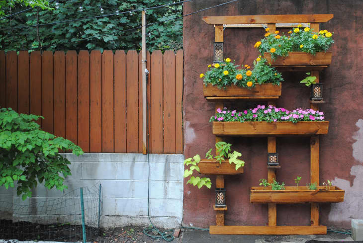 Step 8. Add plants and candles. This is the fun part! I choose to plant a mix of vines, herbs, and flowers in my boxes (with the herbs planted in the lower boxes for easy reach). I also found some remote-operated and waterproof candles that give the vertical garden a really warm glow at night, and I positioned those on the candle mounts, and then attached them to the frame with an eye hook.