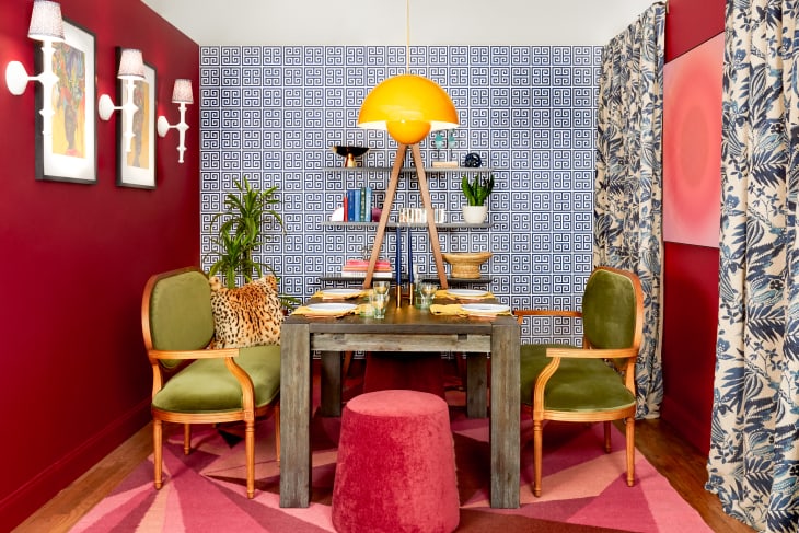 The latter’s exactly how Fahmy put not one, but two green renditions to use for an elegant chair replacement. She also offset the seat’s classic look with modern details like an animal-print pillow, bold paint and wallpaper, and glam ottomans on the opposite sides of the table. After all, by her account, “a small room is the perfect place to bring in rich colors, mix patterns, and incorporate eccentric touches.”