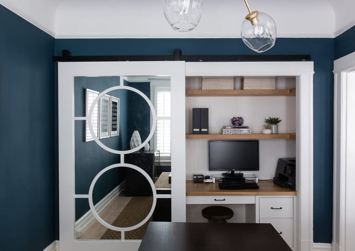 There are plenty of clever ways to successfully integrate a desk area into your living room, bedroom, or basement without majorly disrupting the flow and aesthetics. But sometimes, you just want to keep your work station 100 percent out of sight when it isn’t in use. Spotting a laptop or monitor out of the corner of your eye — or across a room — can make it difficult to truly unplug after hours, and if you’re bothered by desk clutter, well, don’t even get me started. That’s why I was so inspired by this work station I saw while scrolling on Instagram one day; it might be the best use of barn doors that I’ve seen.