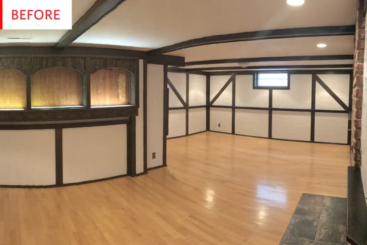 “My husband Steven and I just bought a house in Edmonton, AB, Canada. A beautiful little 4-bedroom 1959 bungalow. The previous owner did all the heavy lifting in terms of reno—redid bathrooms and kitchen before putting the house on the market this past spring. But, aside from redoing (reclaimed gymnasium) hardwood floors in the basement, the rest of the lower level is… well…a tavern. A half-timbered dingy cream stucco kinda-tavern.