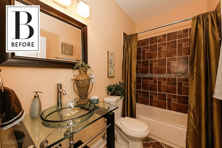 From Becky: The before, to us, was, well …. pretty awful, to be generous with my word choice. It’s a dark, windowless room of 5’x9′. The vanity was a rickety pile of fake wood with a terribly impractical glass sink and top. The tile, while bizarrely interesting, made us dizzy. The paint color was sad, and considering we have other full bathrooms, the tub was not needed here. Overall this bathroom made us feel gloomy.