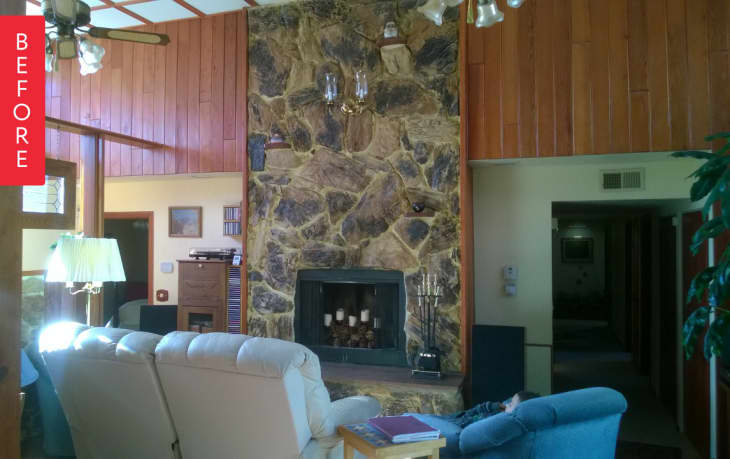 Rachel’s home hadn’t been updated since it was built in 1975, and it was evident in the dark fieldstone fireplace. Not having the funds for a full renovation, she got creative with paint—and boy, does it look great.
