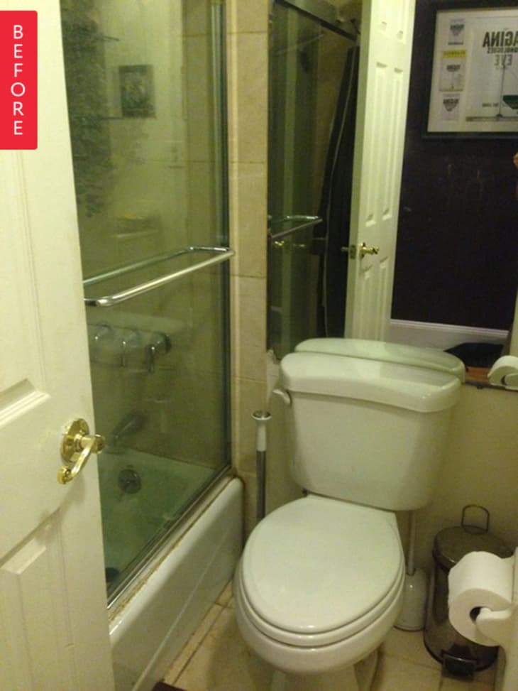 Can you believe this is the same bathroom? Marissa, who worked for years as a lighting designer for off Broadway productions, had an unconventional idea for making this small bathroom seem more spacious. From her theater days she knew that in small rooms without natural light, painting the walls a very dark color actually helps to visually enlarge the space (since the dark walls appear to recede from the viewer).