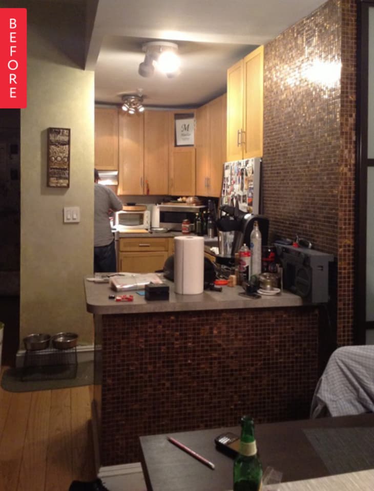 When Cara and Jared moved into their Chelsea apartment, they weren’t too excited about the kitchen’s inefficient layout and dated finishes. But the last straw was when the mosaic tiles (the result of a former homeowner’s DIY project) started falling off the wall.