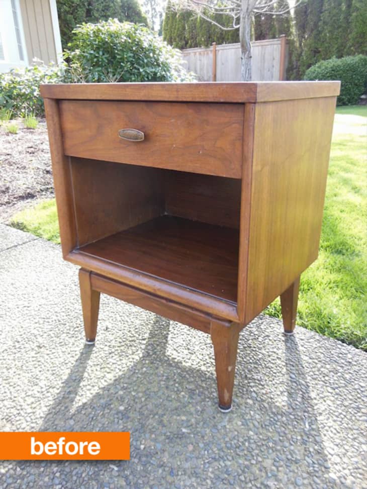 Reeves loved the shape of this kicky MCM nightstand, but wanted to add a dose of fun to the boring, brown exterior.