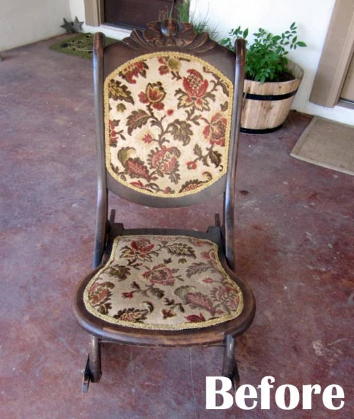 Antique wooden chair with floral upholstery on a porch, labeled "Before."