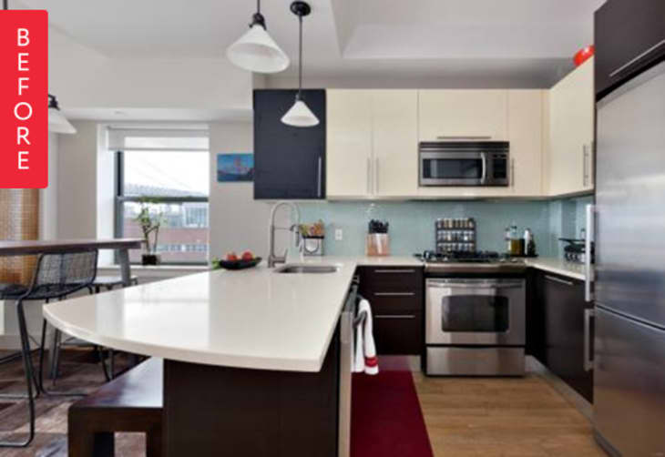They decided that a renovation was in order, and chose to focus on the part of the apartment where they’d get the most impact for the money spent: the kitchen. The apartment’s old kitchen, besides being a little cookie-cutter, was small, cramped, and lacked storage space. Corey envisioned a more open kitchen, one with a little more character and a lot more space.
