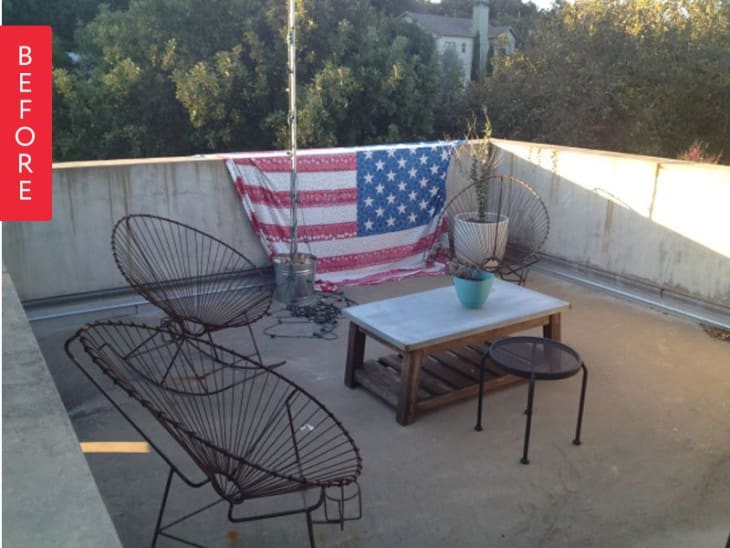 Celine from Aquahaus participated in this past One Room Challenge, and tackled two outdoor outdoor decks on the roof of her Austin home. Here is one of the two, which she calls “Deck A.” As you can see, the original space is reminiscent of an army bunker with tons of grey concrete (and even an American flag). After six weeks, it had an entirely new vibe….