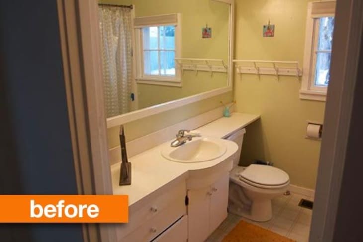 How many of you have moved into a new house that had a bathroom just like this? Although owner Mera tried to put a few bandaids on the style situation as long as she could (with new wall color and a rug), it was a hole in the ceiling and peeling paint that finally prompted a full renovation. See how it turned out…