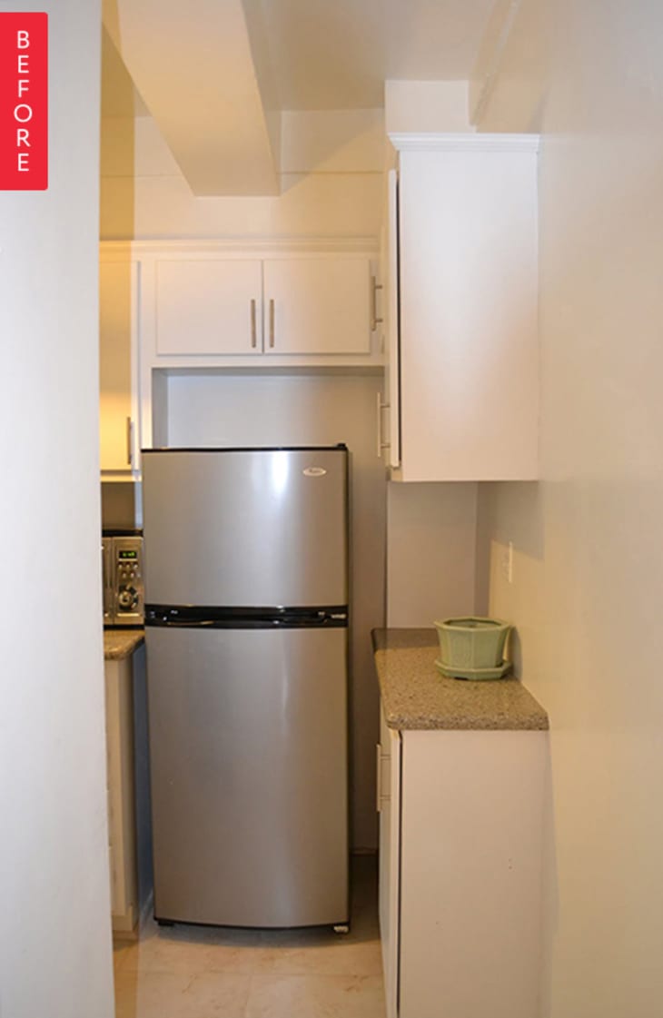 When Pallavi and Keyur bought their one-bedroom Murray Hill co-op, it had a couple of pretty common NYC apartment problems: a teeny-tiny kitchen, and a bedroom with nearly non-existent clothes storage. The little sliver of the kitchen that you see in the photo above was all that would fit in the picture — it was really that small. But since there was no way to expand the footprint of the apartment, to make their kitchen bigger, they had to get creative.
