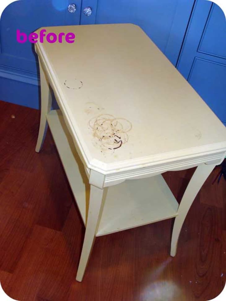 Denese at Plum Life blogged about this table makeover. The table itself has been in Denese’s possession for some time, hence its well used appearance in the before photo. She wasn’t quite ready to give it up just yet so instead of retiring the old table she reinvented it! It took a little sanding to smooth out the old finish but then after a couple of coats of paint and coat of polyurethane for sheen and durability, the table looks brand new.