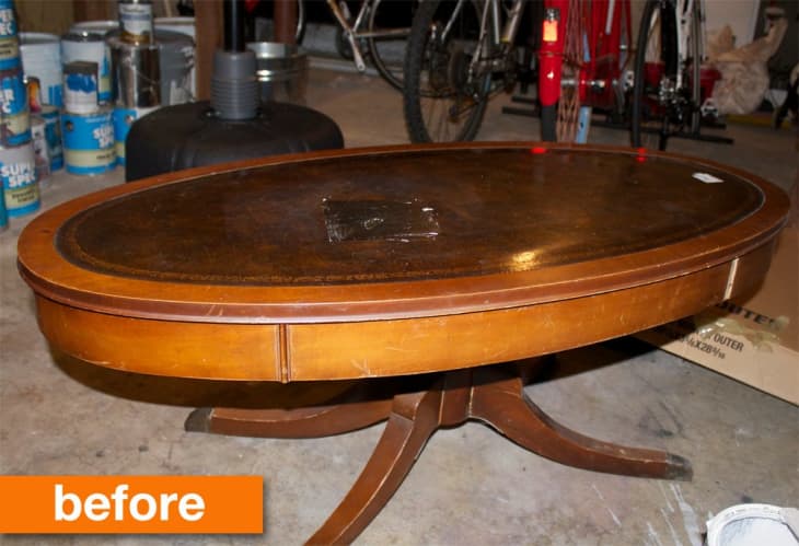 Ellen was looking to recreate a clothing store feel in her dressing room, and already had a large kitchen pedestal table in the space. When she came across this “ugly” 80s table at a Savers thrift store for $7.50, she knew she’d be able to use it along with her existing table to create a neat cluster effect.