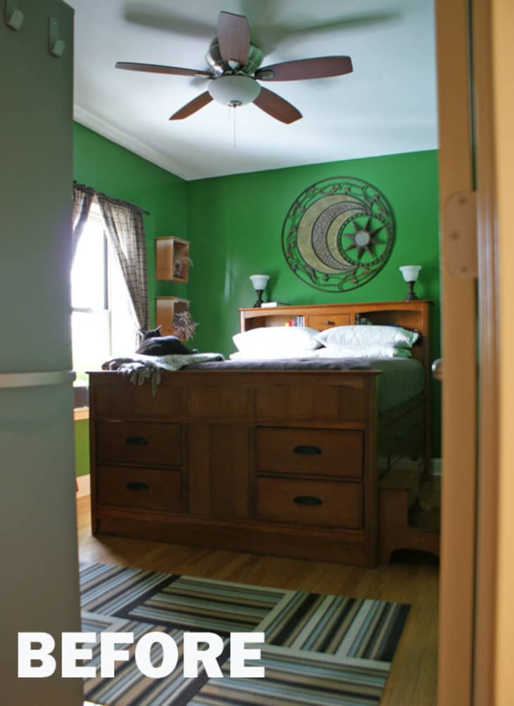 For some reason bedrooms seem to be left as the last room in the house to be decorated. I’ve seen it a lot in friend’s houses and House Tours. I am definitely guilty of neglecting my own bedroom, as you can see in this before photo. I am the first to admit — that room is hella ugly! But in two days I was able to take this room from a decorating disaster to delightful with a couple coats of paint (and some major purging).