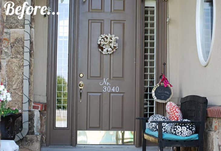 This entryway has been spruced up with some simple black paint. It now coats the front door and has been stenciled onto an inexpensive indoor/outdoor rug from the local hardware store.