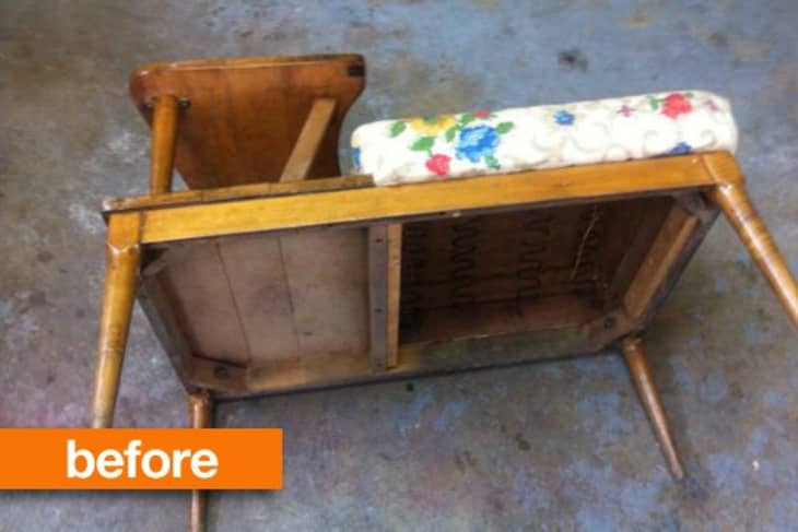 Carithanne says, “Who knows how long this chair sat abandoned in a forgotten basement before my dad rescued it for our next restoration project?” This particular piece was extra exciting because of its classic mid-century design, complete with a production date on the bottom from 1953! The upholstery needed a total overhaul after more than 60 years, but this piece had solid maple bones just waiting for the right person to come along and give it some TLC.
