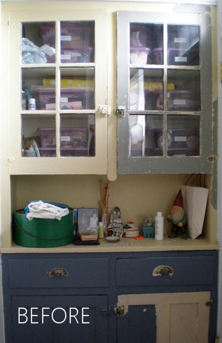 When I moved into my apartment, the built-in cabinet in my bedroom was shoddily painted in yellow and blue with brown “accents.” To make matters worse, there were so many layers of paint that the hinges didn’t work well.