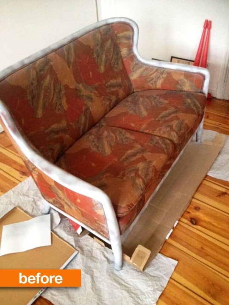 Upholstery is one of the those projects you start with really good intentions, but they often peter out before the piece is totally done. Sibylle knew that recovering her newfound loveseat would be a pain in the ass, and decided to go a totally different route.