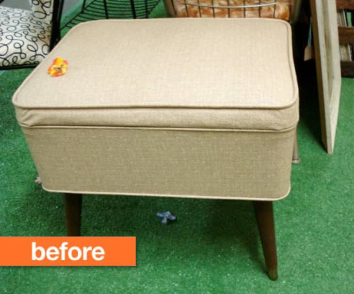 When I saw the photo of this ottoman, I had to look twice because it’s just like one I picked up at the local thrift store several months ago! Just like the one above, mine isn’t in terrible shape, but the upholstery is certainly outdated and could do with a bit of sprucing up.