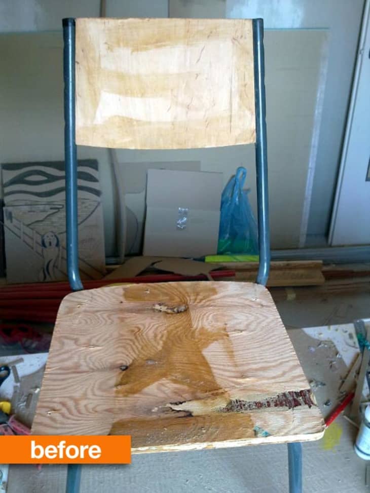 Here’s kind of a cool thing. This steel-framed chair had seen better days. Enter Janusz, who has an abiding love for the world’s most humble material — cardboard — and for bringing old furniture back to life. Click here to see what he did next.