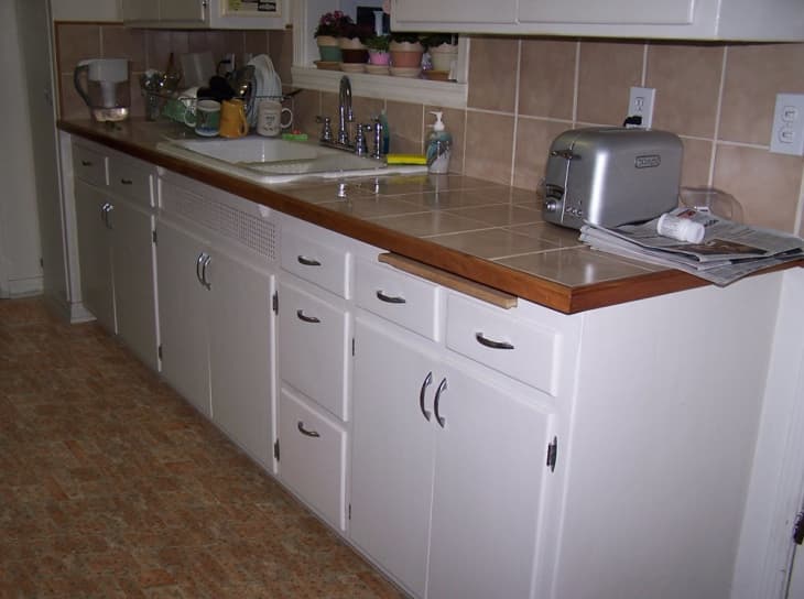 This was such a fun project that was done at my mom’s house. She purchased a house that had its original 50’s cabinetry. However it has poorly done brown tile countertops, faux brick vinyl flooring, and overall just felt dated. Instead of doing a full kitchen gut, we decided to do a “Retro Kitchen Restoration.”